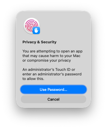 Since version 10.15.X “Catalina”, MacOS prevents non-notarized applications downloaded from the Internet from running.