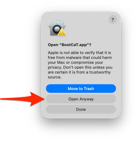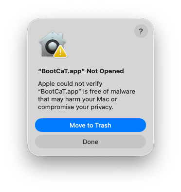 - Click “OK” or “Done”, do not “Move to Trash” or you'll have to re-install BootCaT.